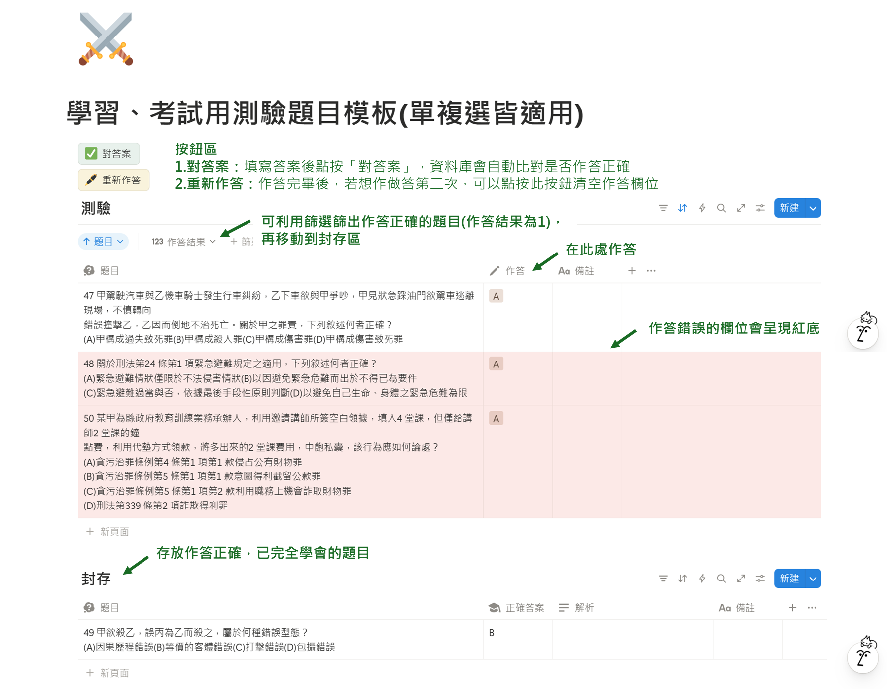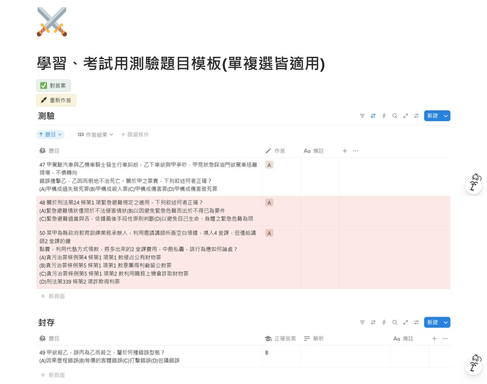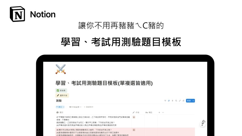 【NOTION模板】 學習、考試用測驗題目(單複選皆適用)(免費)